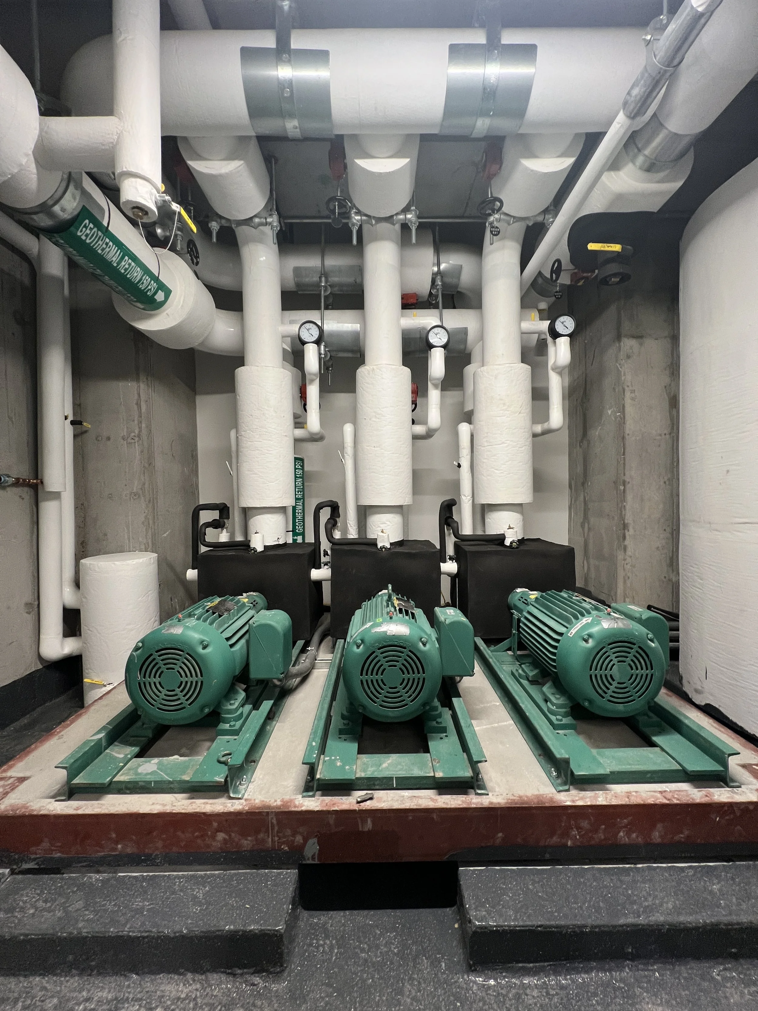 With 31 bore holes, each 1,500 feet deep, the heating and cooling system is expected to provide over 300 tons of heating/cooling capacity. Heat pumps use the temperature differential the earth provides to draw heat from the ground in the winter and to expel heat in the summer.